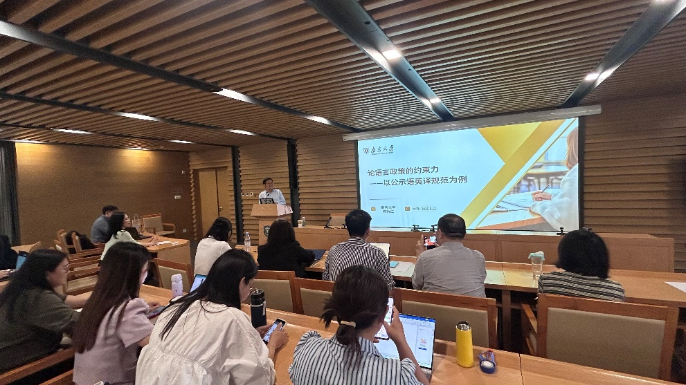 讲座中,陈教授指出,语言政策的约束力受制定主体层级、内容明晰度、违规成本等因素影响,其实际效能呈现多样性、复杂性和动态性特征。他以长三角地区公示语英译为例,揭示政策执行中“有章不循”的深层原因,并提出基于语言治理观的协同监管机制优化方案。