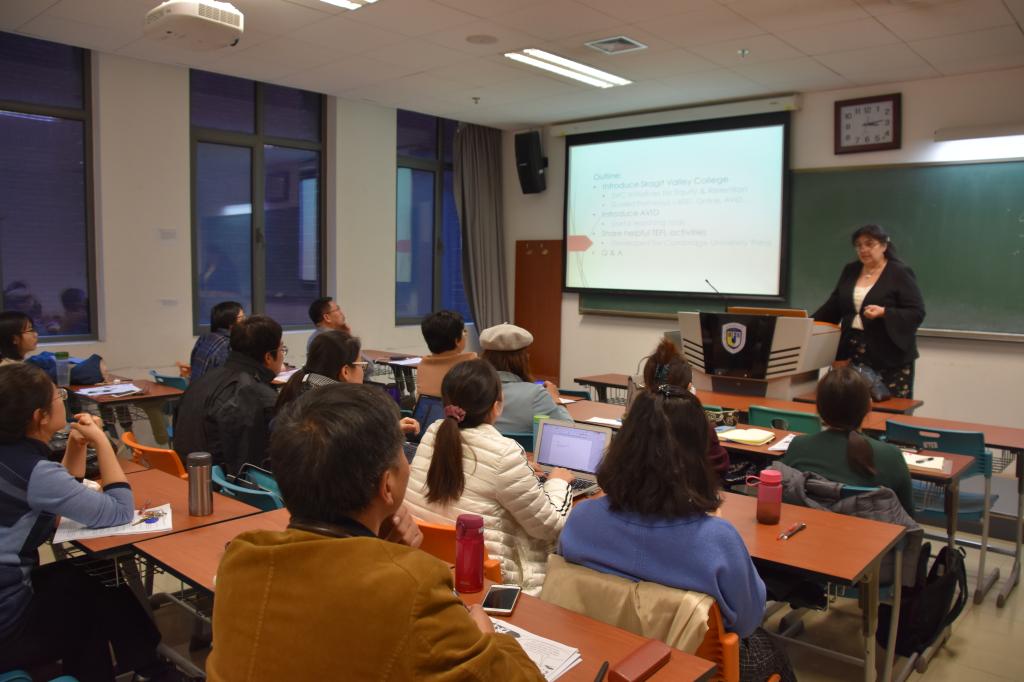 11月13日,由pg游戏电子模拟器英语视听说教研室口语课型组组织的教学沙龙“交际语言教学法工作坊”在西校区国际大厦310室成功举办。教学沙龙主讲人、外国专家Neta Simpkins Cahill是美国华盛顿州斯卡吉特谷学院的终身教授,现任ESL学术英语系系主任,本学年来pg游戏电子官网进行交流讲学。Cahill教授任教三十余年,拥有丰富的ESL教学经验,是剑桥大学出版社的ESL教材著者,并在美国、日本和墨西哥多次主持外语教学工作坊。来自pg游戏电子官网和国内其他大学的访学学者和部分学生共计40多人参加了本次工作坊,主持人为文圣老师。