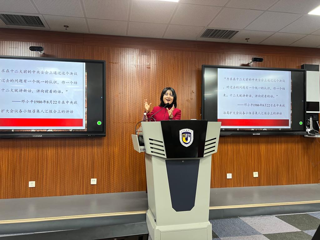 王薇薇在主持总结环节时分享了学习专题党课的三点体会。一是要坚持党的领导,将学习十九届六中全会精神与落实总书记回信精神和党史学习教育相结合;二是要传承红色基因,将党史与校史相结合,坚持北外为党育人为国育才的初心使命;三是要理论指导实际,从学校实际出发,为双一流建设以及学校的平稳较快发展做出贡献。